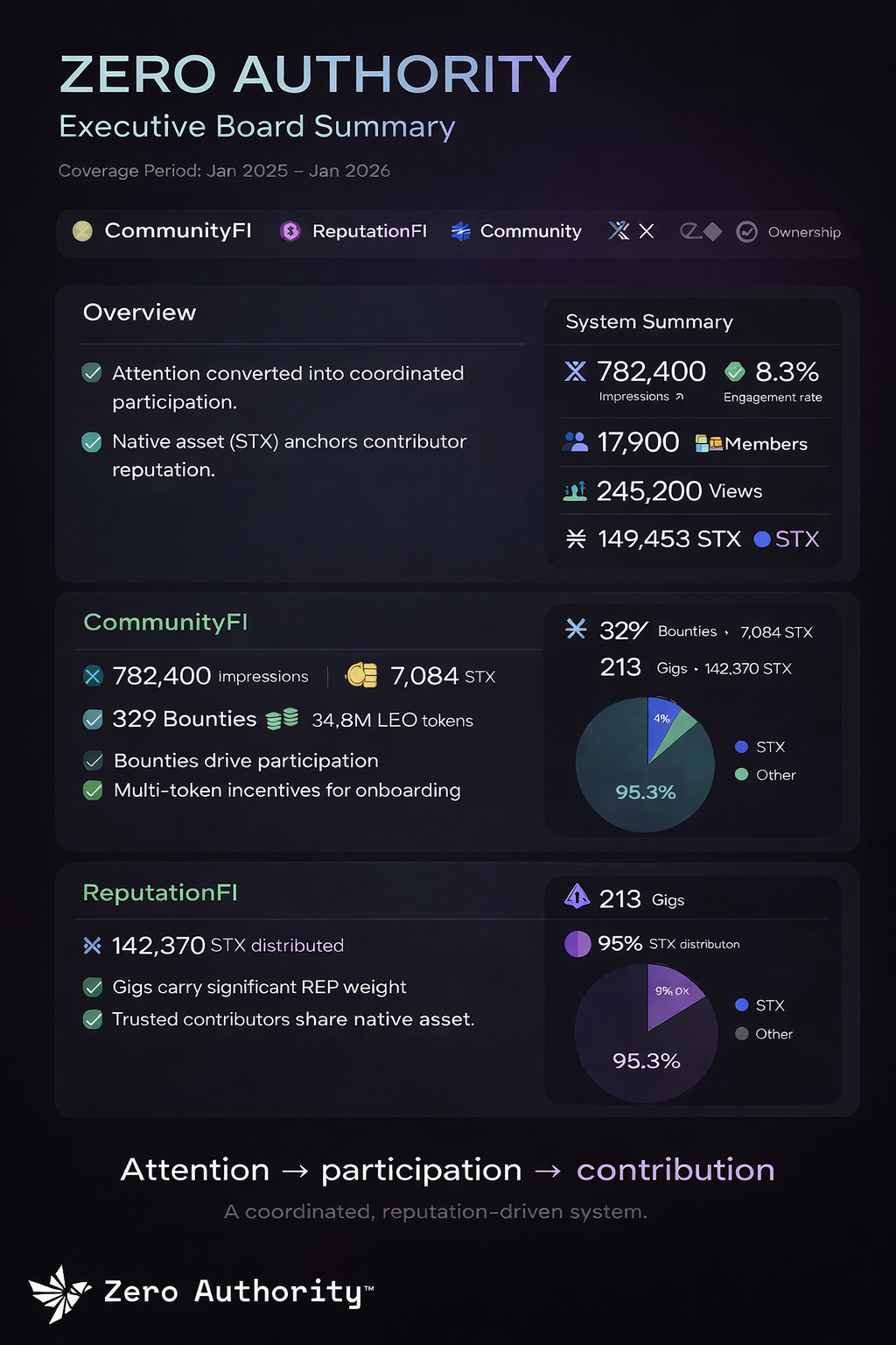 This analysis evaluates Zero Authority as a **coordination system**, not a social brand. The objective is to measure how effectively attention is converted into participation, and participation into economically meaningful contribution.